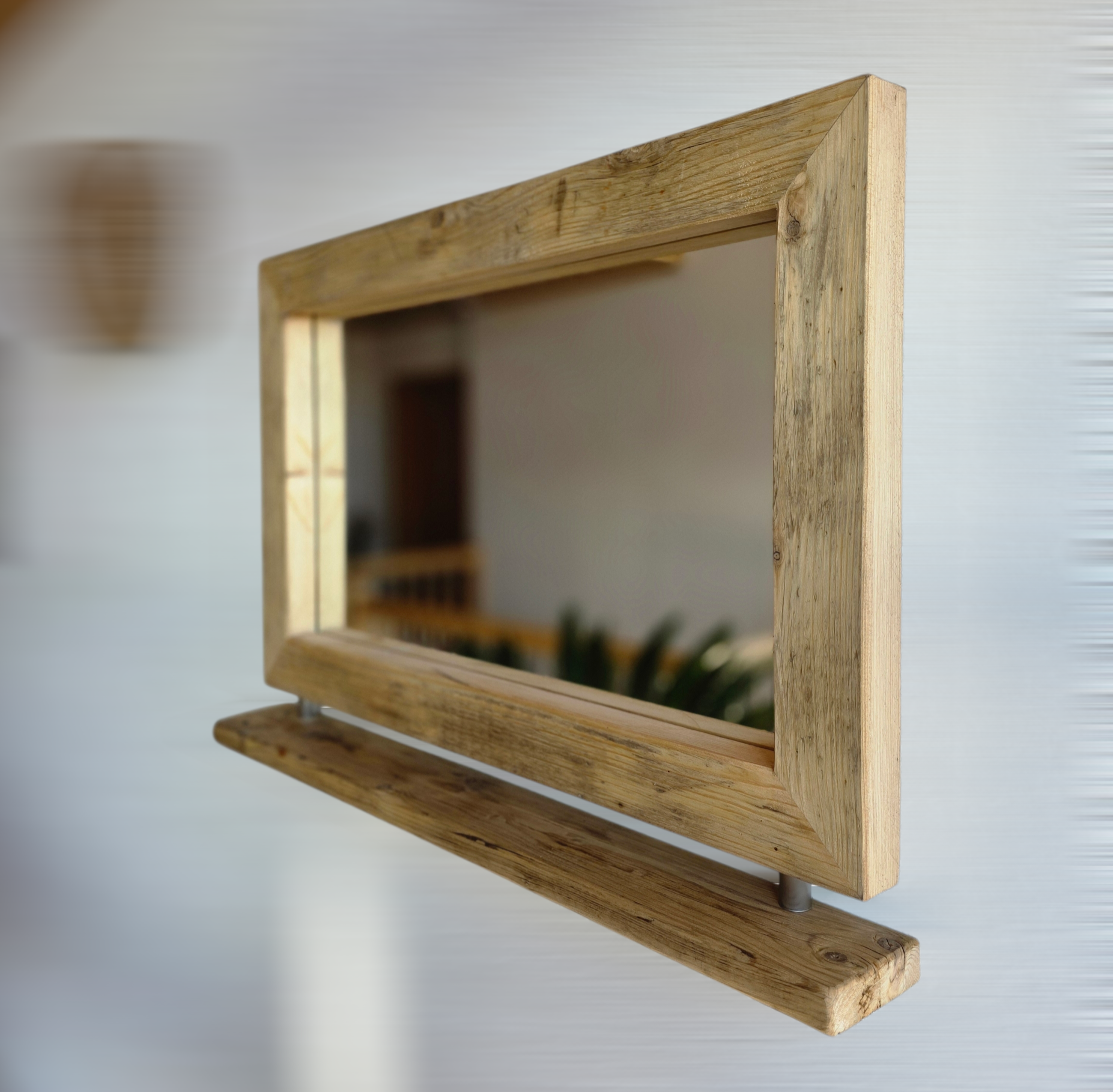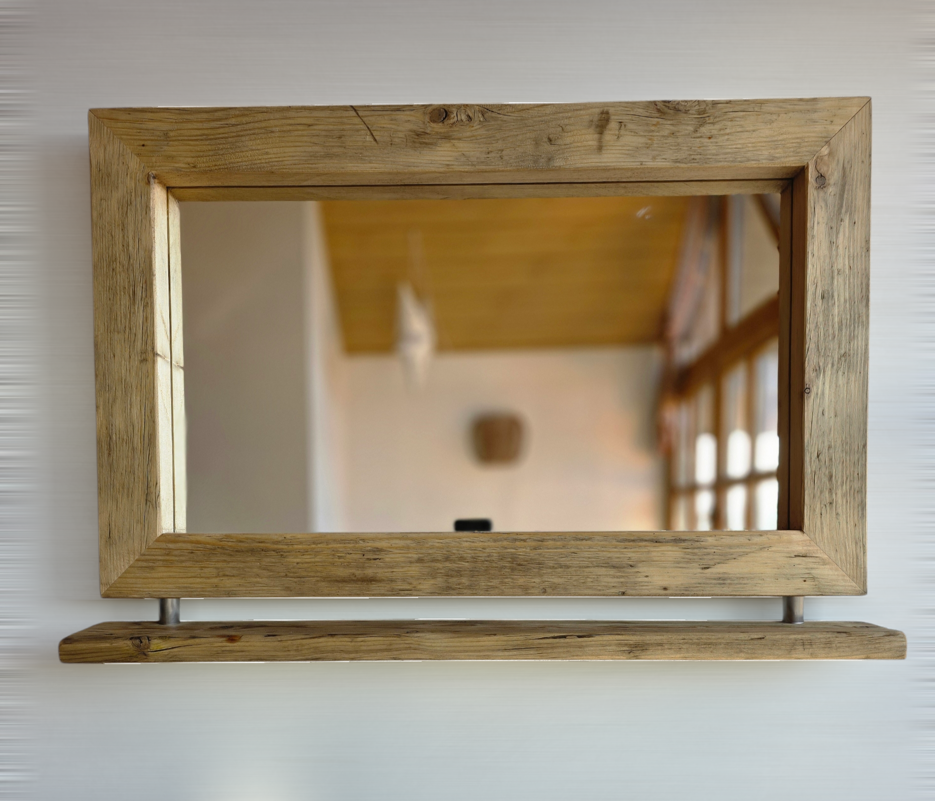 Altholz Spiegel, Wandspiegel Holz, Spiegel Industrial, Spiegel mit Ablage, Spiegel Edelstahl, Rustikaler Spiegel, Nachhaltige Einrichtung, Handmade Spiegel, Spiegel Badezimmer, Loft Stil